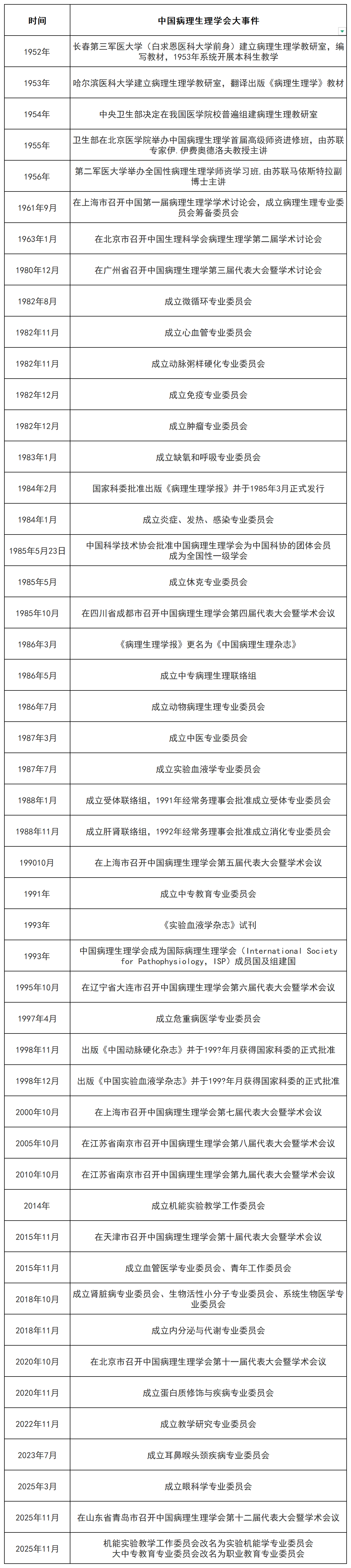 中国病理生理学会学术工作大事记